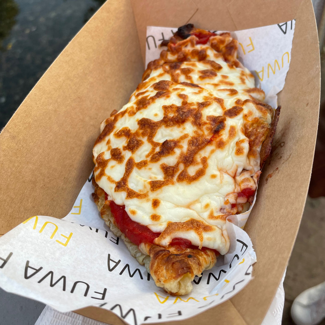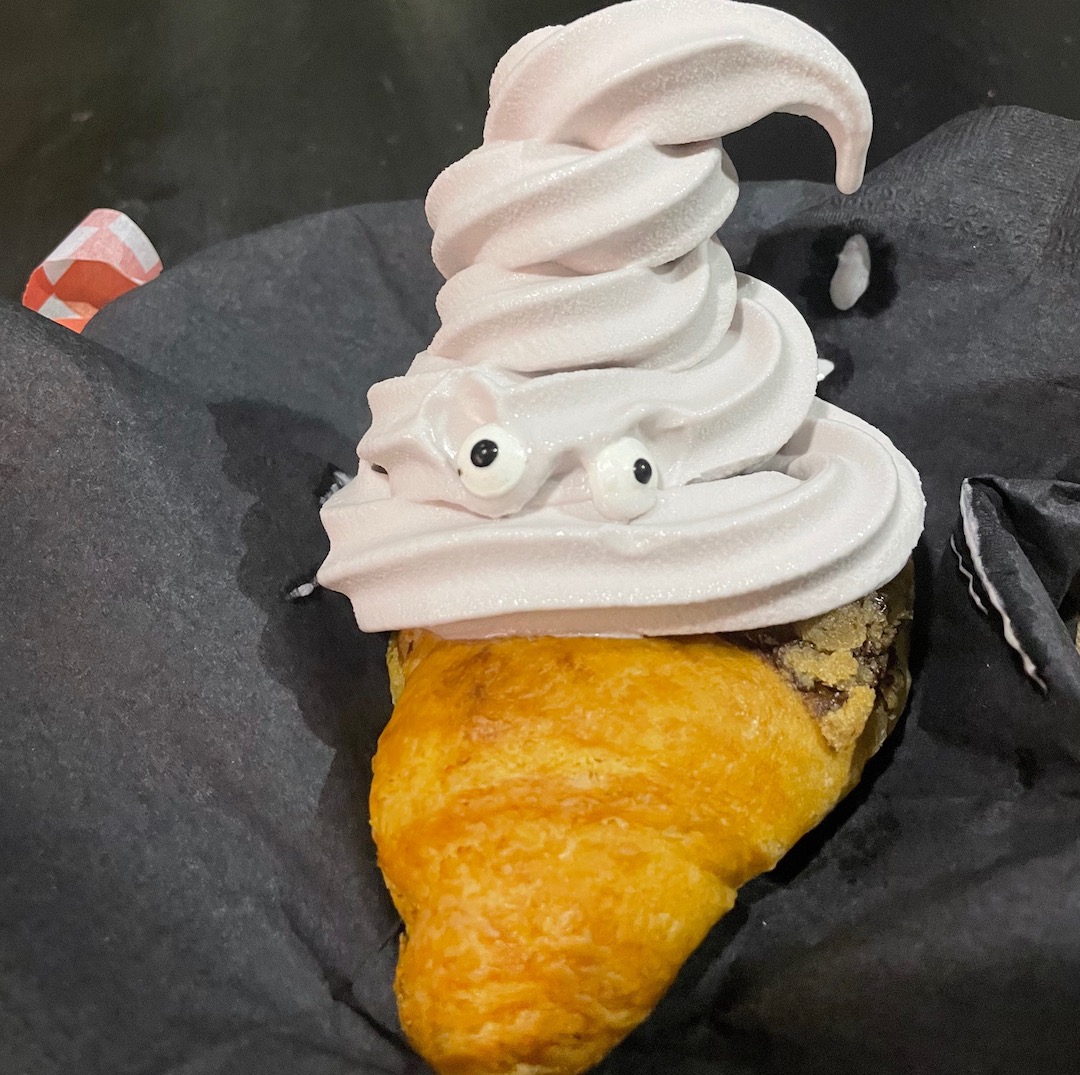 It’s a solidly acceptable and flaky chocolate croissant topped with soft serve ice cream and some googly eyes meant to anthropomorphize the dessert. Its actual appearance — a melting, dripping mess slowly dampening and breaking down said pastry — was comically unlike the pristine product photo on the Legend Dairy booth’s billboard. I wouldn’t particularly recommend it, but its components were at least complimentary despite the aura of blobfish.