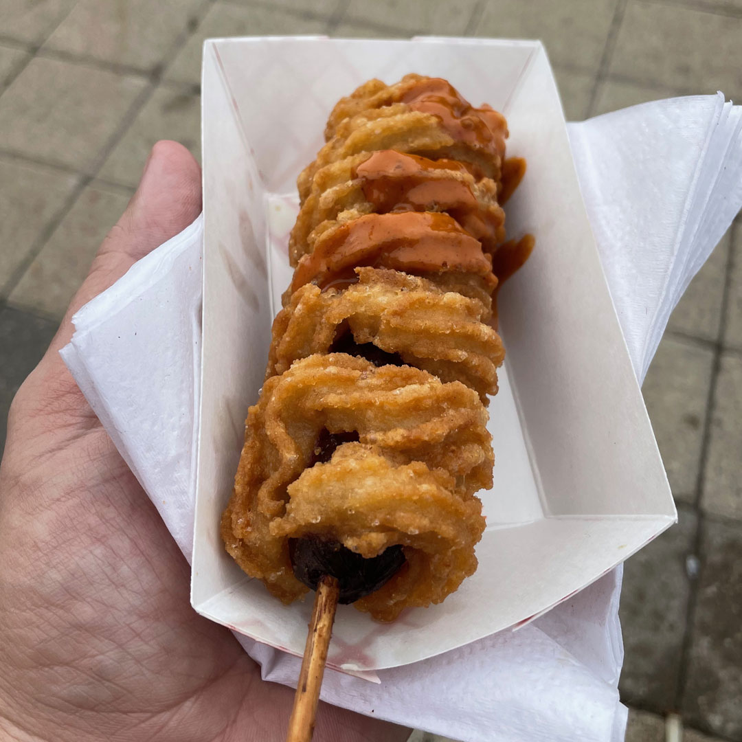 Things I ate at the C.N.E. in 2020 (COVID National Exhibition Edition). Including Double Wiener Cheese Curd Pretzel Hot Dog and Bacon-Wrapped Veggie Corn Dog.