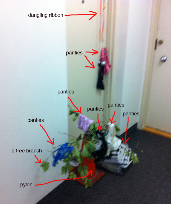 The base was a stack of grocery store flyers of the sort that get left in every lobby of every building in the city. On top of that was an orange pylon. Then, inserted into the hole at the top of the pylon was a tree branch. And on the branch? Multiple pairs of women’s panties. There were also some panties on the doorknob as well as a ribbon dangling from the top of the door.