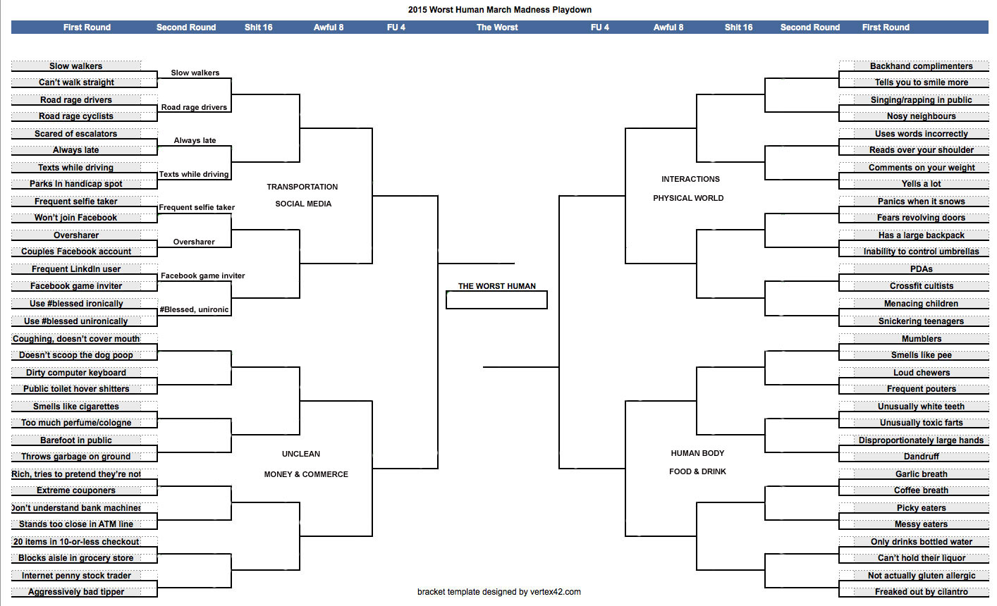 Broken down into eight conference — Transportation, Social Media, Unclean, Money & Commerce, Interactions, Physical World, Human Body, Food & Drink — and 64 separate actions/traits/human ticks, Risky Fuel has organized a March Madness-style tournament to determine what makes… The Worst Human of 2015.