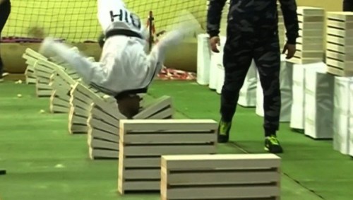 Kerim Ahmetspahic breaks cement blocks with head.
